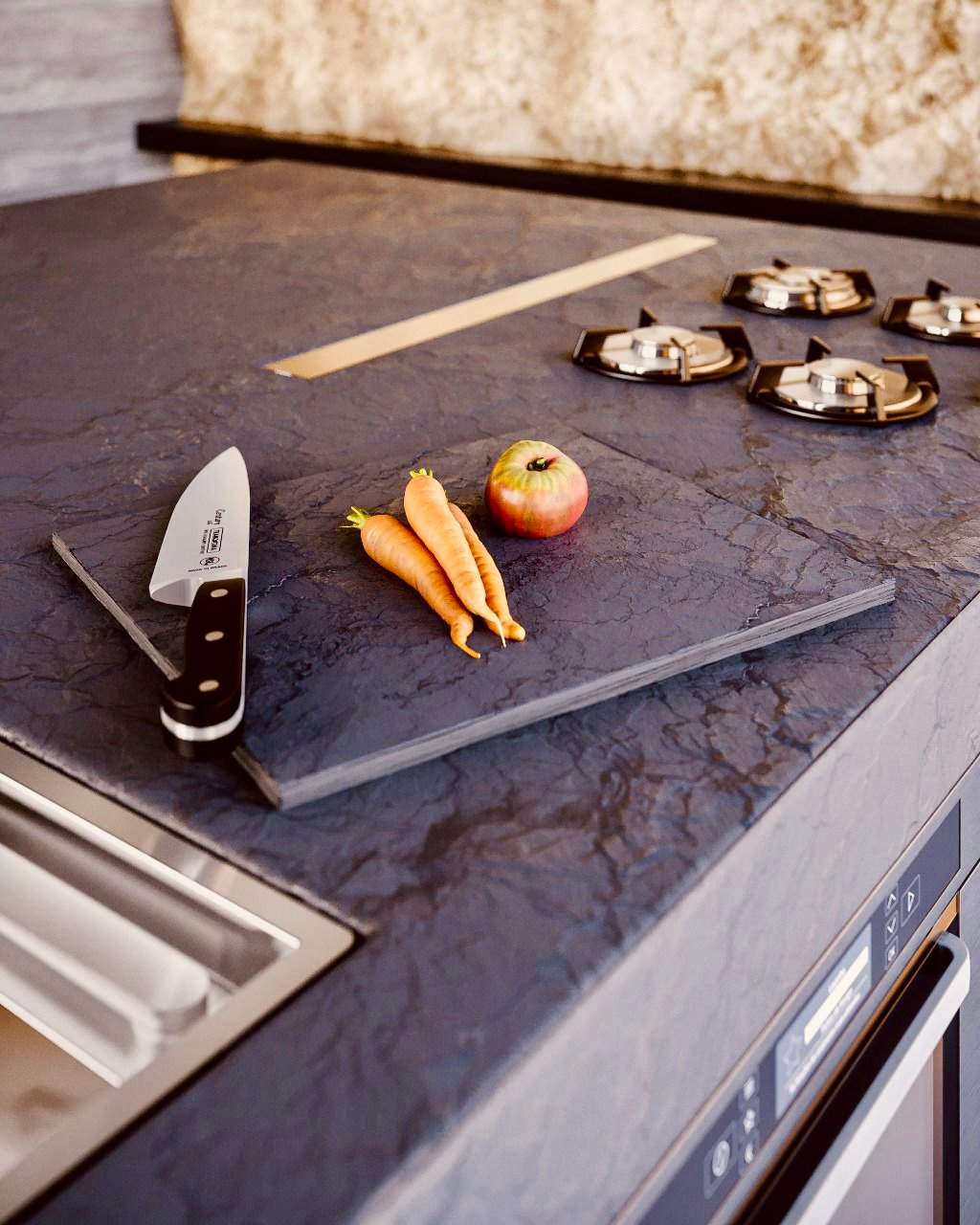 Utilizamos a Cuba Deca Supra pois a peça se camufla com a textura da bancada, em uma ardósia bruta, deixando as texturas mais uniformes, bem como os eletrodomésticos escolhidos e armários mimetizados ao material.